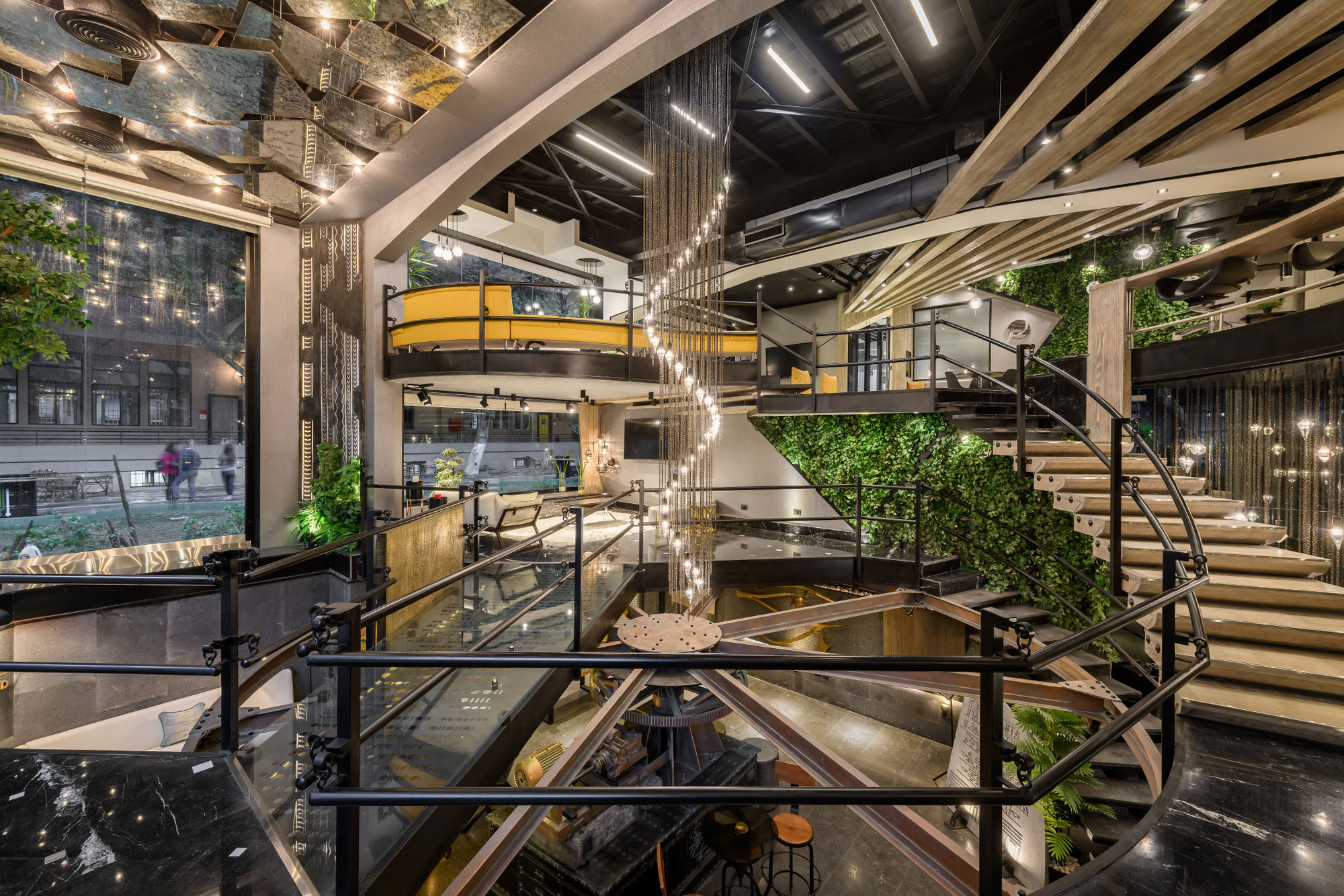 В процессе реставрации проявились некоторые оригинальные черты проекта, в первую очередь – вращающийся механизм сцены в качестве центрального элемента. Поворотные столы, которые обычно используются для смены сцен в театре, смотрятся фантастично в дизайне интерьера. Создается ощущение, будто вы перемещаетесь в прошлое. Неудивительно, ведь внутреннее убранство офиса пестрит и другими отсылками к прошлому.