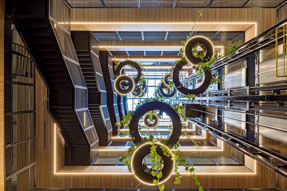В результате получился висячий сад с 20 подвесными горшками диаметром 1200 или 1800 мм и весом до 260 кг каждый, подвешенными под световым люком девятиэтажного атриума.