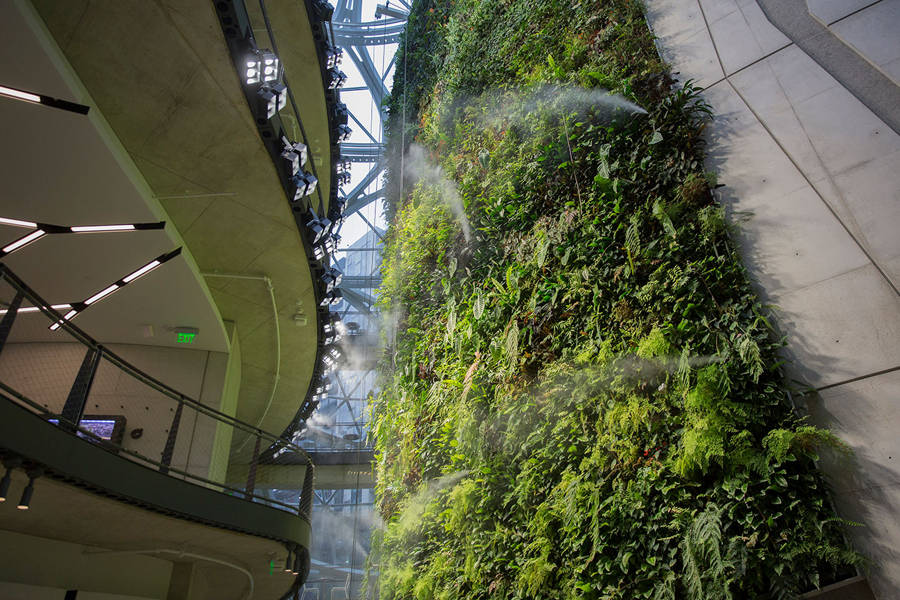 Гигантская 4-этажная живая стена - центральная точка Сфер - вносит значительный вклад: 25 000 растений высаженных на 371,6122 квадратных метров.