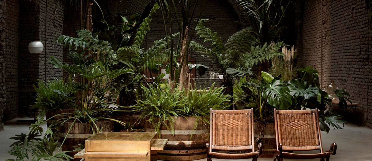 В интерьерах представлена фактурная палитра, состоящая преимущественно из дымчато-серых и приглушенных тонов, тонко контрастирующих с яркой зеленью тропической растительности. Связь с природой посредством присутствия листовой зелени является не только украшением, но и концептуальным фоном для фотосессий и мероприятий. А стол, спроектированный Дэвидом Лопесом Кинкосесом, и кресла, которые Le Corbusier и Pierre Jeanneret создали для Чандигра в Индии, напоминают нам о философии модернизма и изысканной миланской культуре. Галерея попадает в правильную ноту и намерение создать вневременную среду, созданную с использованием классического дизайна, вьетнамских ваз и современной скандинавской мебели. Драма создается с помощью текстурированных поверхностей землистого цвета и бумажных фонариков, добавляющих гармоничное сочетание ручной работы и модернистских форм. Подобно скульптуре лампы Isamu Noguchi‘s, освещающей бистро и частную столовую, прекрасно дополненную антикварными акцентами, они создают интимные уголки под одной крышей. Команда SIX создала в Милане впечатляющее и неожиданное секретное место, одновременно простое и артистичное. Аутентичность интерьеров усиливается натуральными материалами некоторых известных классиков мебели, которые объединяют восприятие открытых и внутренних садов и создают целостный контейнер.